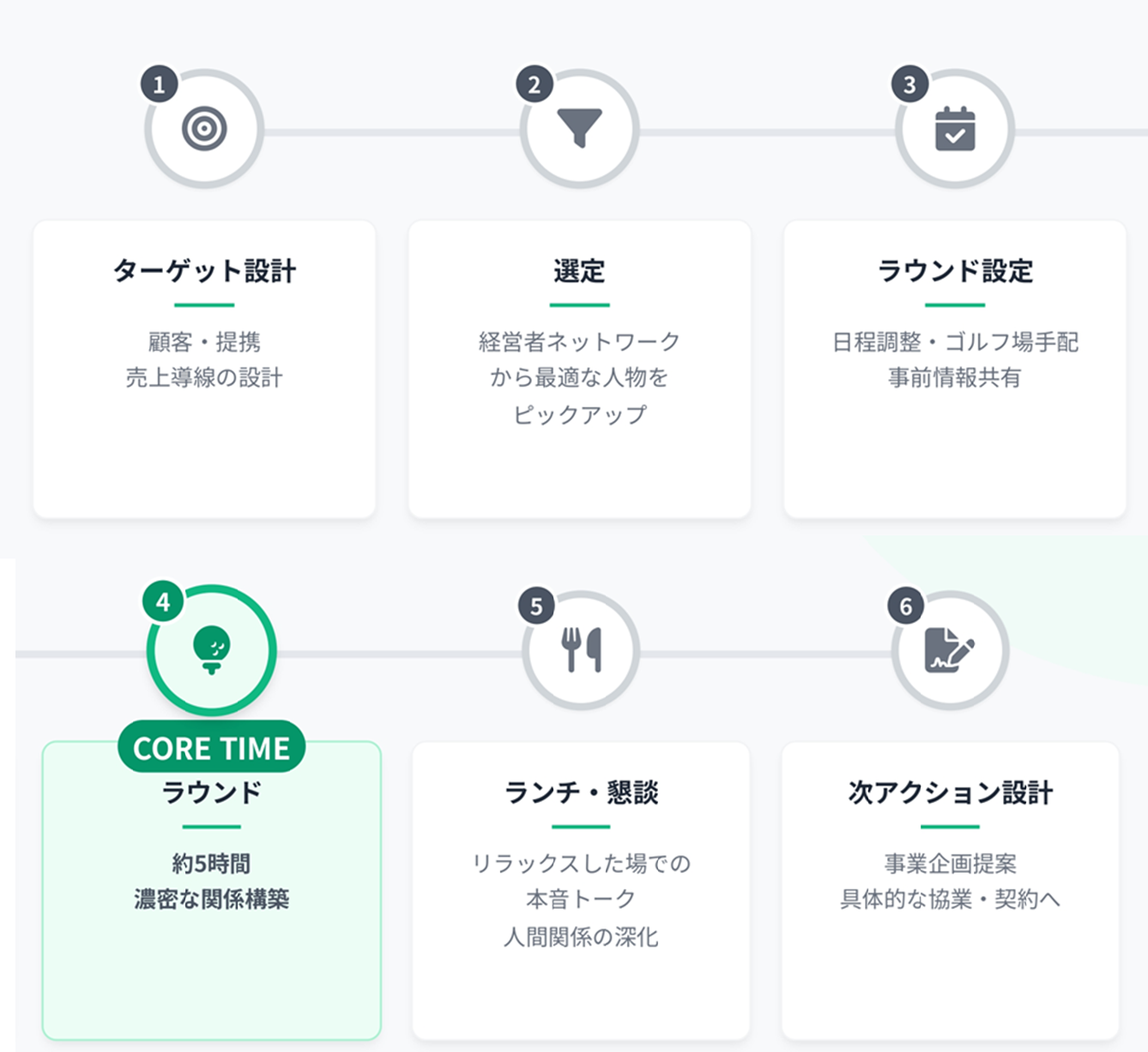 具体的には、ターゲット経営者の選定とマッチングゴルフの場での関係性設計とファシリテーション、そして売上創出までの導線設計と検証を一貫して提供するのが弊社の事業です。